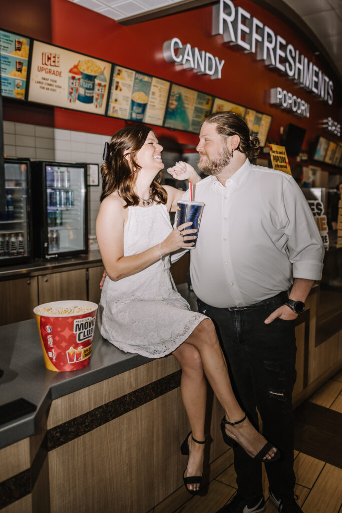 The neon lights of the theater, the cozy seats, and even the nostalgia of walking through those familiar doors made this session feel so personal and meaningful. Instead of just snapping pretty photos, we were capturing their story; the memories of where it all started and the promise of everything that’s to come.